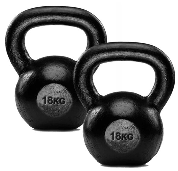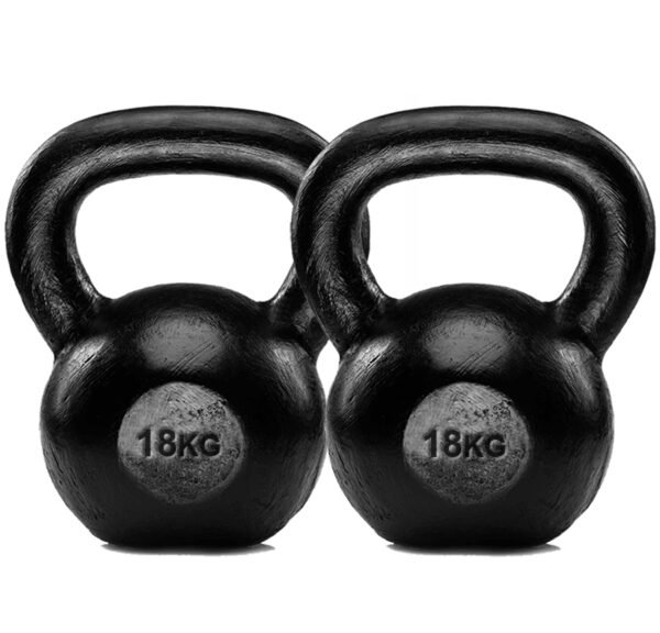 2 pesas rusas de 18kg cada una en hierro resistente color negro.