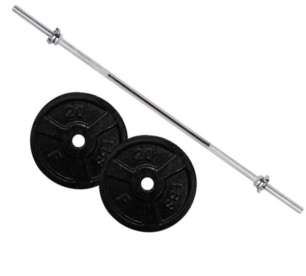1 barra de 150cm cromada con 2 seguros roscales, mas 2 discos de 20lb en hierro color negro, producto nuevo somos fabricantes directos.